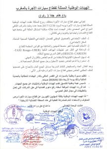 و يضيف البلاغ أنه تم إتخاذ عدة قرارات عقب هذا الجمع بالإضافة إلى تنظيم المسيرة الوطنية بالسيارات تمت الموافقة على تأسيس هيئة وطنية للتنسيق تضم الهيئات الوطنية و التمثيليات عن جميع الجهات و كذا رفع دعوى قضائية في حق الشركات التي تعمل بالتطبيقات في مجال النقل العمومي .