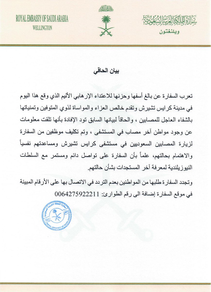 وفي البيان الأول، قالت السفارة على صفحتها في “تويتر” إنه “في إطار متابعتها لحادثي إطلاق النار في مسجدين بمدينة كرايست تشيرش في الجزيرة الجنوبية أثناء صلاة الجمعة لهذا اليوم 8/7/1440هـ الموافق 15/03/2019 وما نتج عنه من قتلى وإصابات، تبين إصابة مواطن سعودي بجروح، وتم الاطمئنان على صحته وسلامته”.