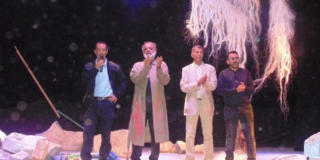 بالمحصلة العرض انطوى على خلجات انسانية عميقة من حب و غضب و ألم … كأنما ذ. “عبد الاله السماع ” استنطقنا جميعا بكافة هواجسنا و تناقضاتنا الداخلية في المكاشفة مع الذات … و اتضاح الادراك الجامع للمخرج و تراكمه من خلال الاستعانة ” بدارالفنان” التشكلي “محمد الحراق ” التي تعكس ريشته جمالية ذوقه الرفيع سواء من حيث الاشراف على السينوغرافيا أو كسر التحولات الزمنية في العرض ببراعة دقيقة بطريقة ذكية و عبقرية في الاضاءة المواكبة للتعاقب من خلال فرض أسلوب _المخرج_ لعناصر أخرى مثل الجدران المتكسرة و الأحذية العتيقة التي أرادها كمشاهد للمأسوية مع شجرة منسدلة تأخذ الحيز الجانبي الأيمن بدت كسلطة دينية تفرض الموت و الاحياء مدعومة بإضاءة بنفسجية و خضراء وزرقاء وحمراء وسوداء تبلور عوالم الانسان من اشكالية الوجود النفسي المضطرب و المناخ العالمي الممزوج بالدم .